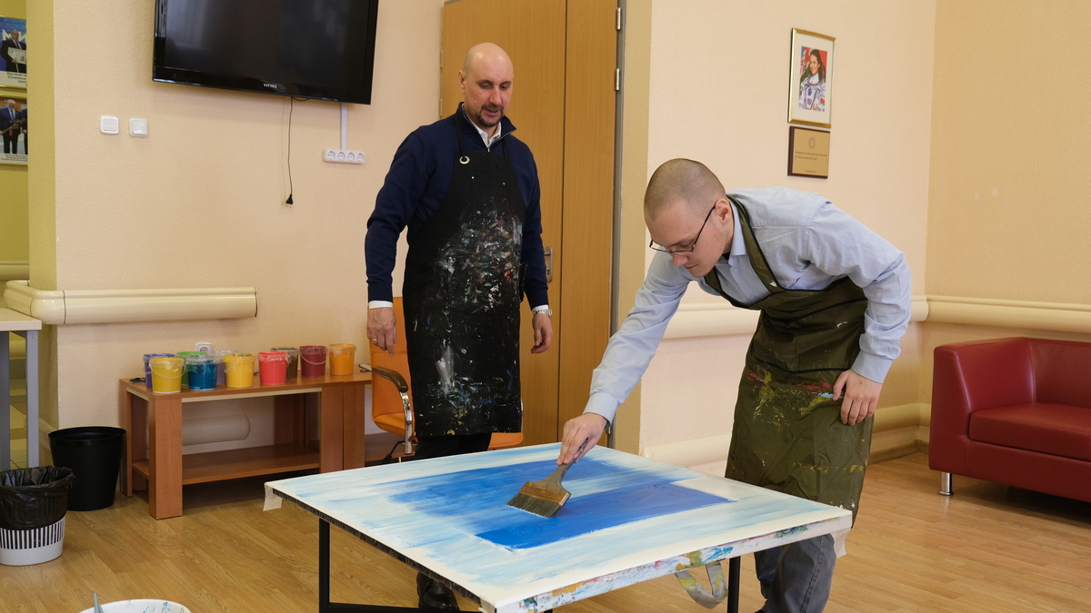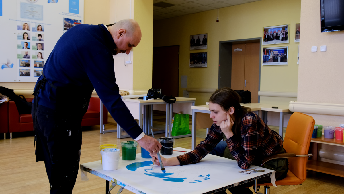 У Полины уже есть опыт написания картин несмотря на то, что она только частично зрячая. Перед началом работы она показала художнику свои картины, которые он высоко оценил.